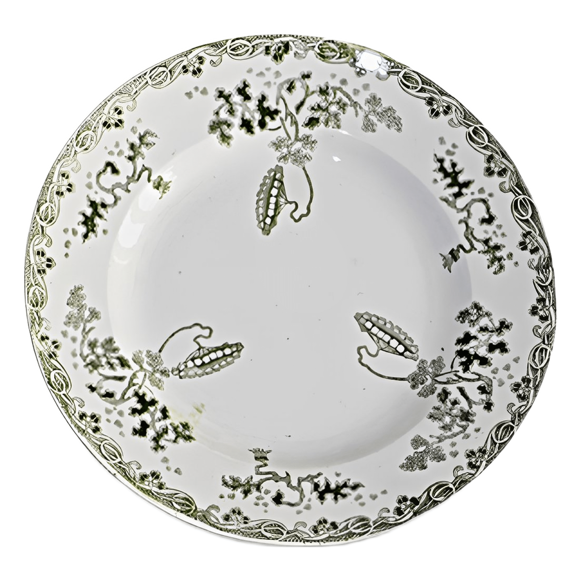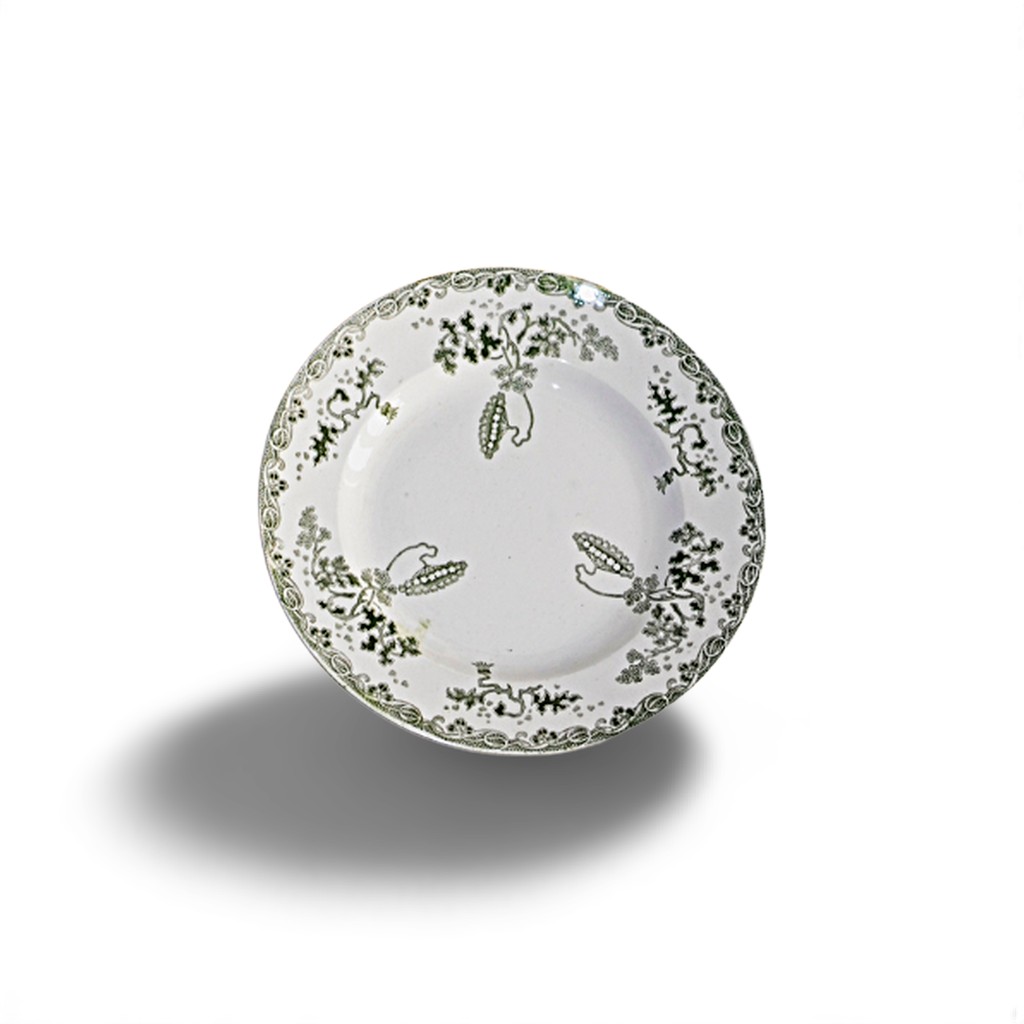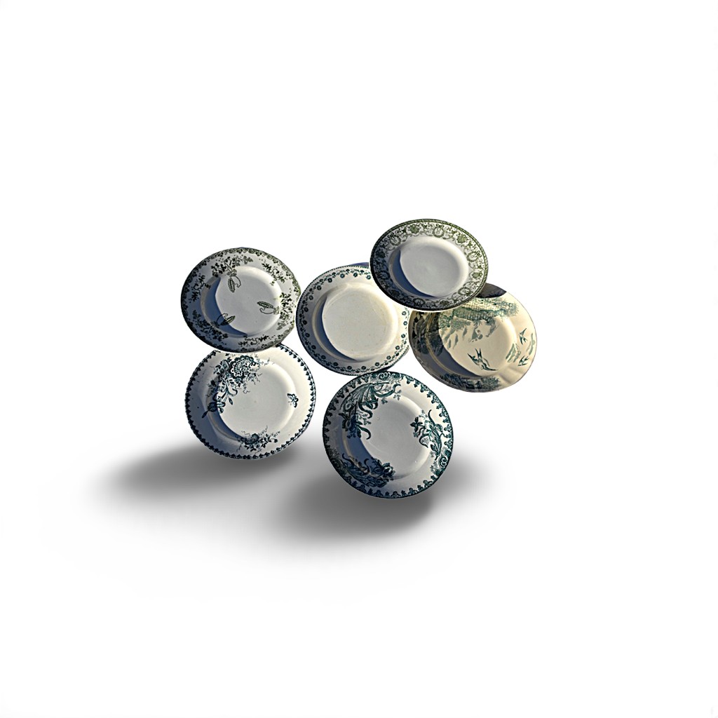 Les assiettes mesurent entre 23 et 24 centimètres de diamètre, et sont ornées d’un décor monochrome vert ou bleu-vert.
