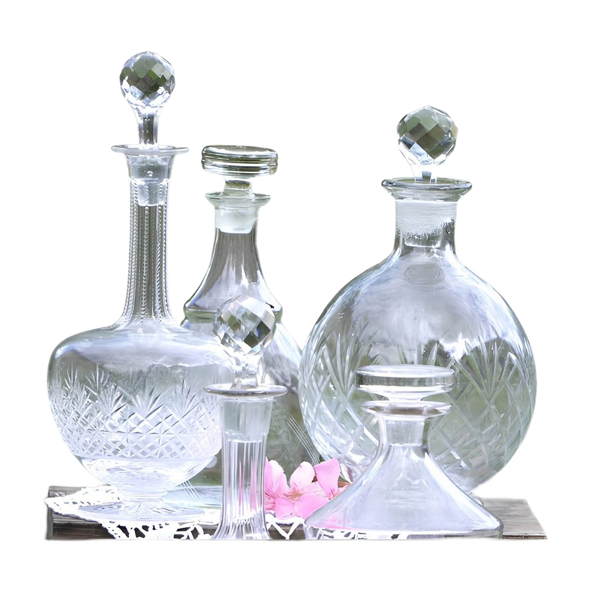Location de carafes anciennes en verre ou en cristal. Il s’agit de carafes ciselées ou gravées, toutes dotées d’un bouchon. Elles peuvent être utilisées pour carafer du vin et le servir, mais aussi pour servir de l’eau. Toutes ces carafes sont dépareillées, hormis quelques paires. Outre leur utilité, les carafes sont un atout de charme pour vos tables et l’ambiance élégante de votre cérémonie.