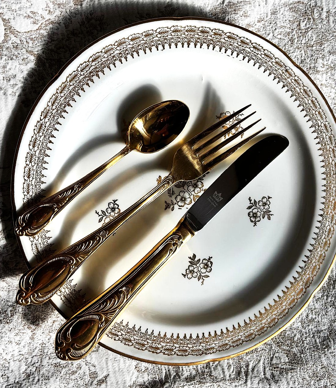 Depuis quelques saisons, les couverts s’habillent de doré, mat ou brillant, pour rehausser les tables de fêtes. Ces couverts, pour la plupart fabriqués à bas coût dans des usines chinoises, pullulent désormais dans toutes les enseignes spécialisées ou non, d’ailleurs. Nous n’allons pas redire ici ce que nous inspire cette façon de produire en masse des artefacts si bien marketés qu’ils en deviennent désirables, sans souci des matériaux que vous allez porter à votre bouche, ni des humains qui les fabriquent. Toutefois, nous souhaitions proposer à la location des couverts dorés, vintage et de qualité. Parce que les tables royales ne se sont jamais privées de couverts en vermeil, ceux-ci symbolisent à jamais le luxe et le raffinement.