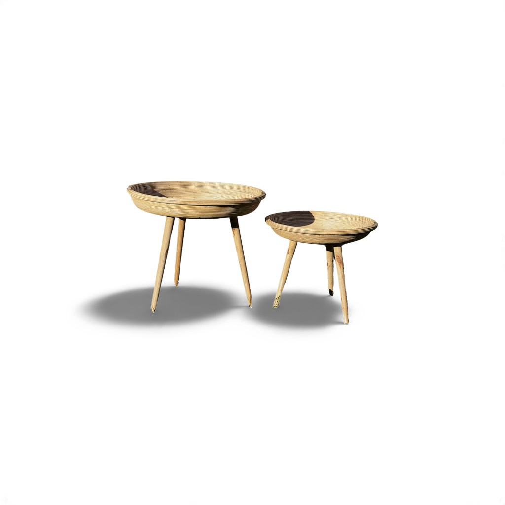 Location d’un duo de tables basses en bambou pour vos événements.