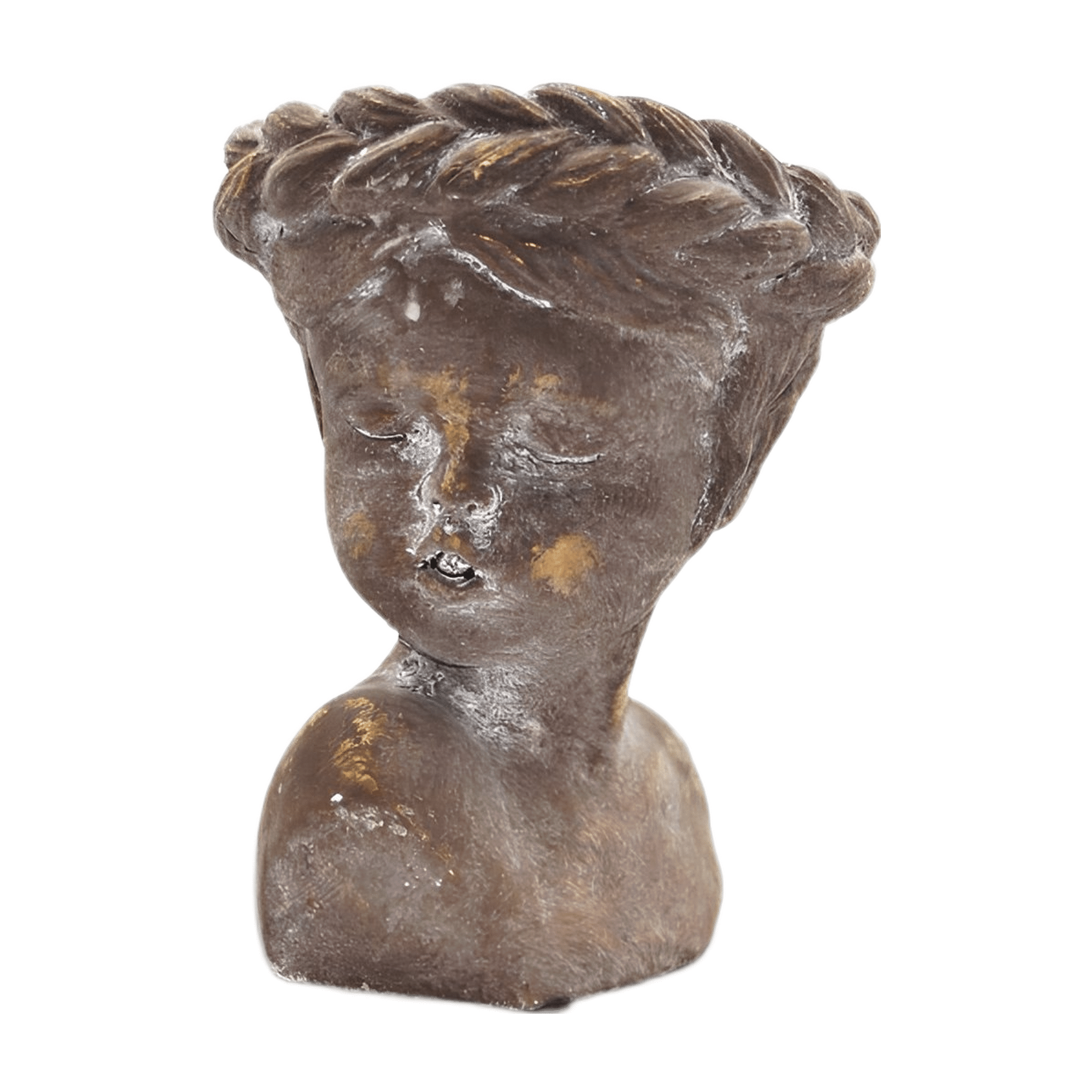 Est-ce un ange ou un cache-pot ? Les deux, assurément. Ce joli visage d’ange en ciment patiné a quelque chose d’une présence bienveillante, une part d’innocence qui ne manquera pas d’éveiller l’empathie de vos invités. Posé sur ue table d’accueil, juché sur une pile de vieux livres, ce petit ange insinuera une idée de l’élégance classique. Le ” plus produit “, comme disent les désespérés de la vente, c’est qu’il est aussi un cache-pot. Vous pouvez le décorer d’une plante fleurie dans son pot, rien de plus simple, ou, au moyen de mousse mouillable, le décorer de fleurs coupées. Avec de la mousse sèche, ce seront des fleurs séchées et des graminées. Il offre donc un bel éventail de possibilités.