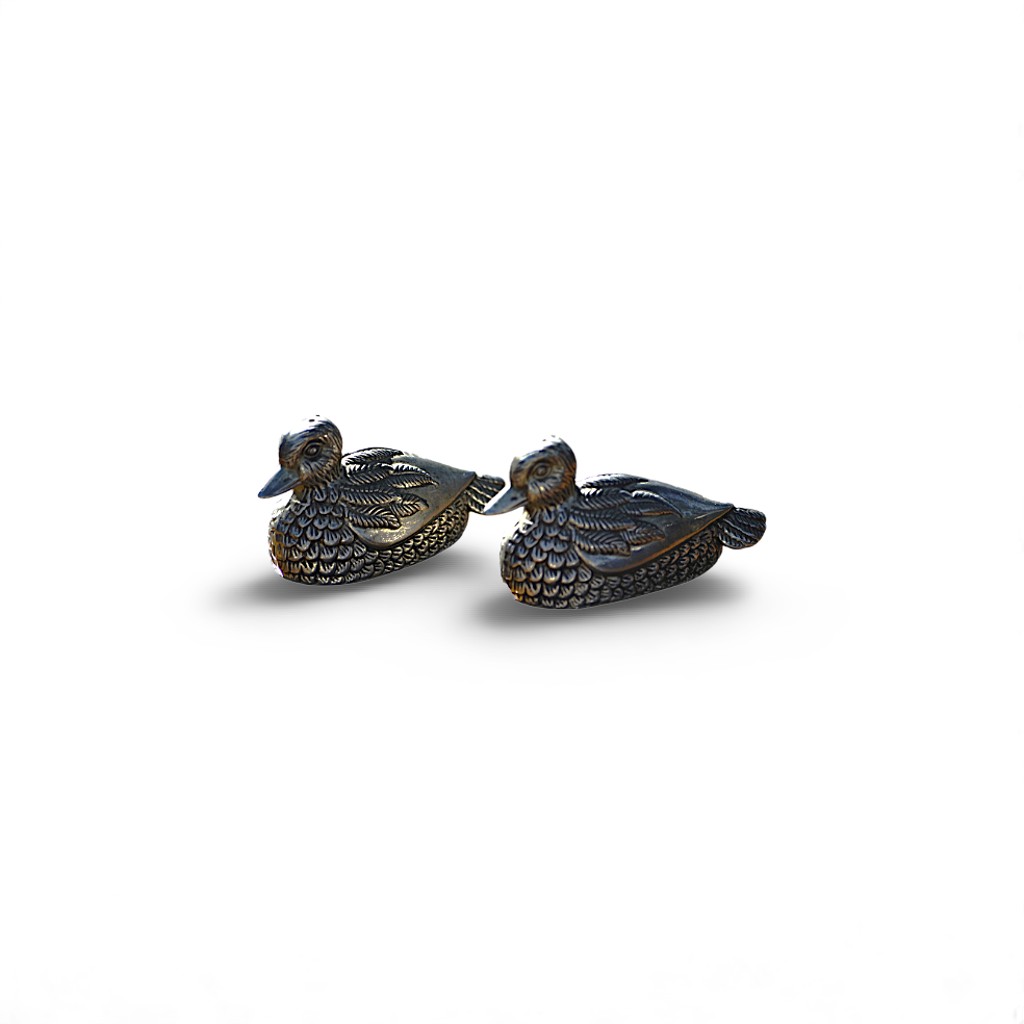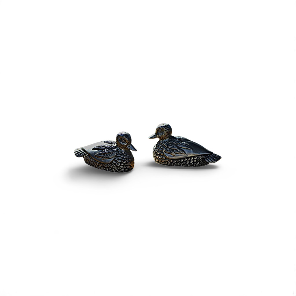 Location d’un couple de canards en métal argenté salière et poivrière.