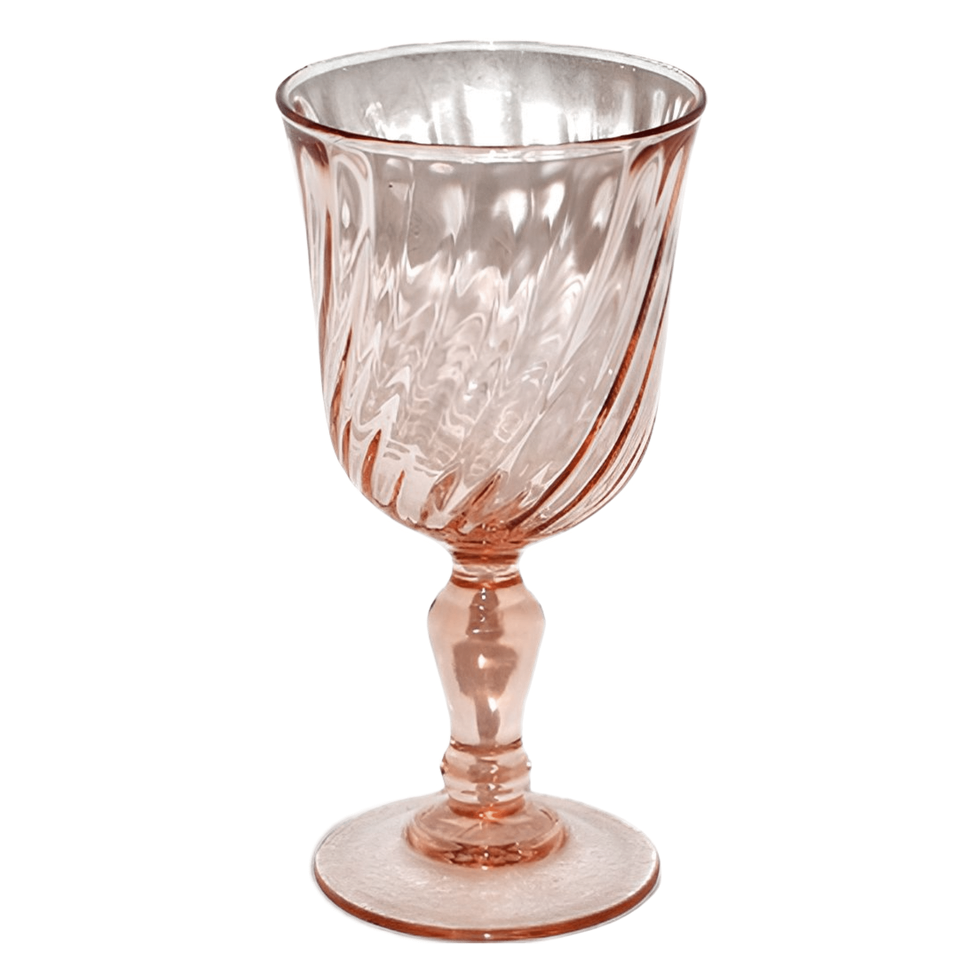 Location de verres Rosaline vintage, forcément vintage, puisqu’ils ne sont plus fabriqués. Dans les années 1970, l’entreprise Arcoroc Luminarc développe, toujours dans la logique industrielle qui a fait son succès, ces verres torsadés roses, résistants et jolis. A l’époque on les voit dans toutes les cuisines (lorsque j’étais enfant, nous buvions dans ces verres). Puis ils sont passés de mode. Aujourd’hui, ils reviennent en force, on redécouvre leur élégance toute simple, les torsades raffinées, le rose délicat. Mixés avec d’autres verres vintage, ils font leur petit effet sur une table romantique.