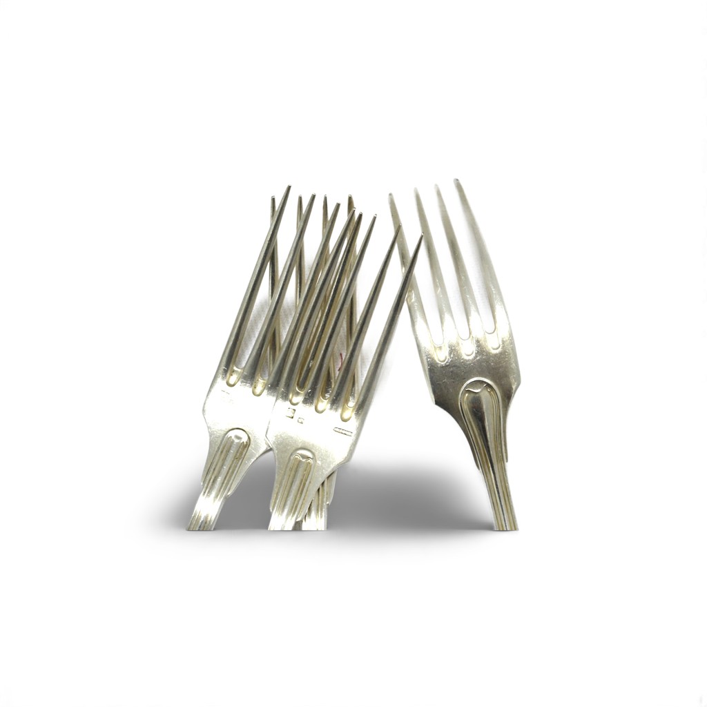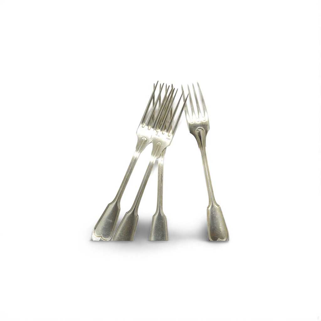 Il s’agit de fourchettes vintage du modèle Filet. Ce modèle, classique, sobre et élégant, s’accorde parfaitement aux couteaux en métal argenté et aux couteaux à manches en corne de notre catalogue.