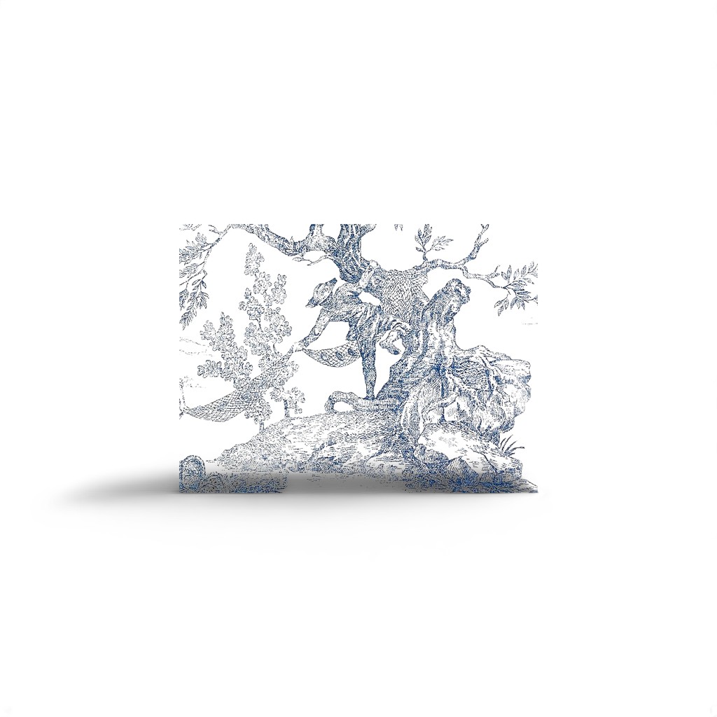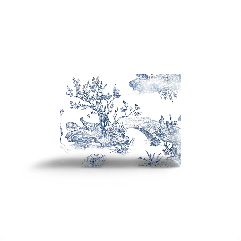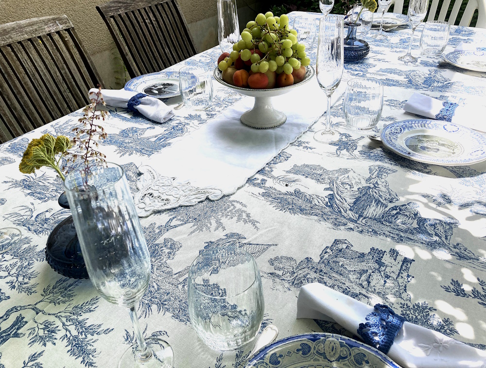Location de nappes en toile de Jouy bleue pour vos événements.