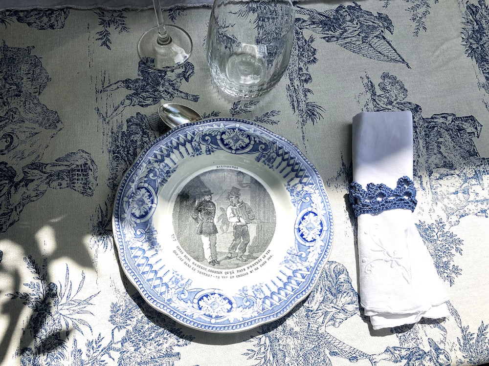 Ces nappes en toile de Jouy ont été confectionnées dans notre atelier, avec un très joli tissu de coton demi-natté imprimé toile de Jouy qui possède un beau tombé et une densité qualitative. Avec ce tissu sur vos tables, vous entrerez dans l’univers des tables champêtres de jadis, sophistiquées tout de même, et absolument chics. Misez sur l’originalité et la tendance d’un grand classique de l’ameublement détourné en nappe. Pour aller sur ces nappes, nous aimons ces assiettes anglaises bleues de Staffordshire avec un dessous d’assiette en rotin blanchi.