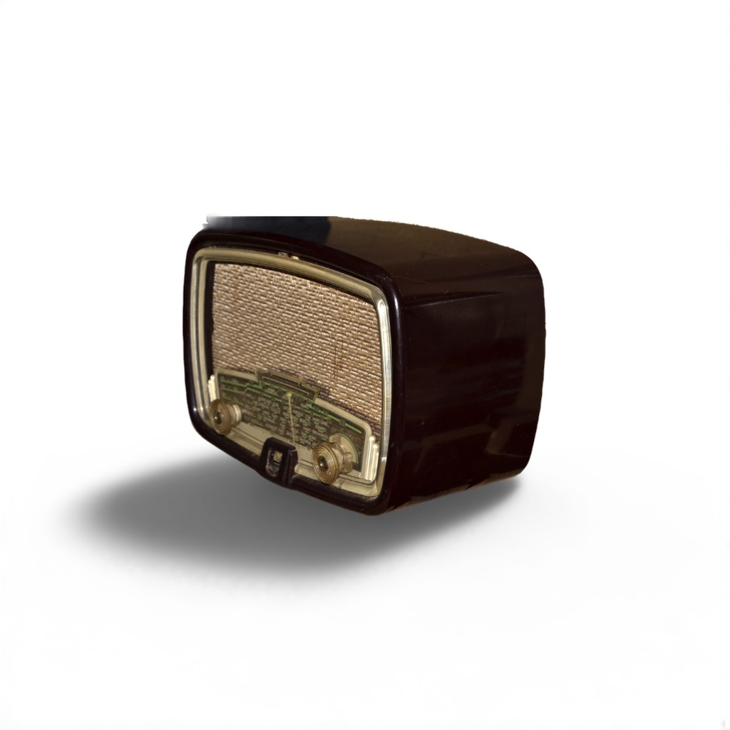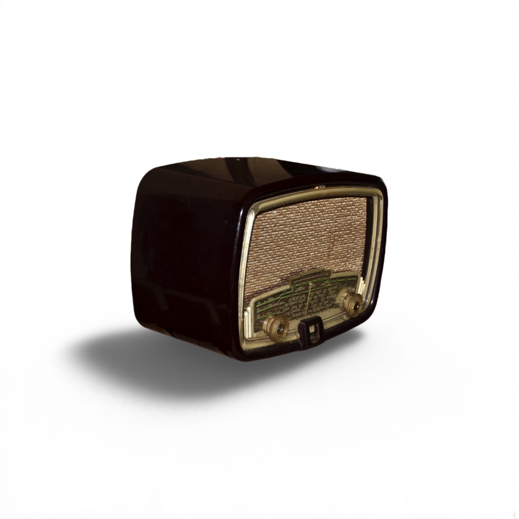 Location d’un petit poste radio en bakélite authentique, tout droit venu des années fin 1950-1960. Il n’est pas en état de marche, mais son look rétro, sa bakélite brillante et foncée, en feront une pièce phare de votre décoration vintage.