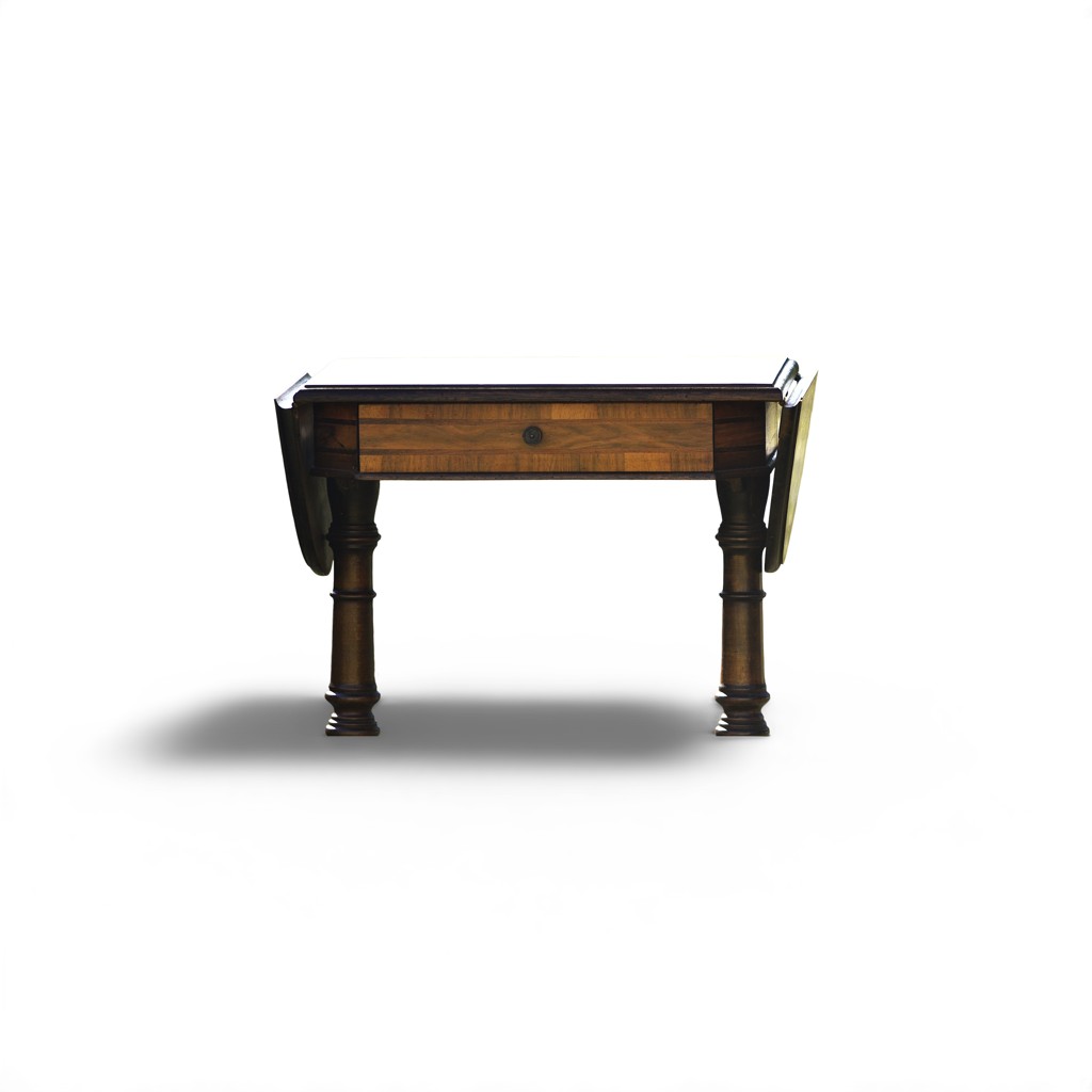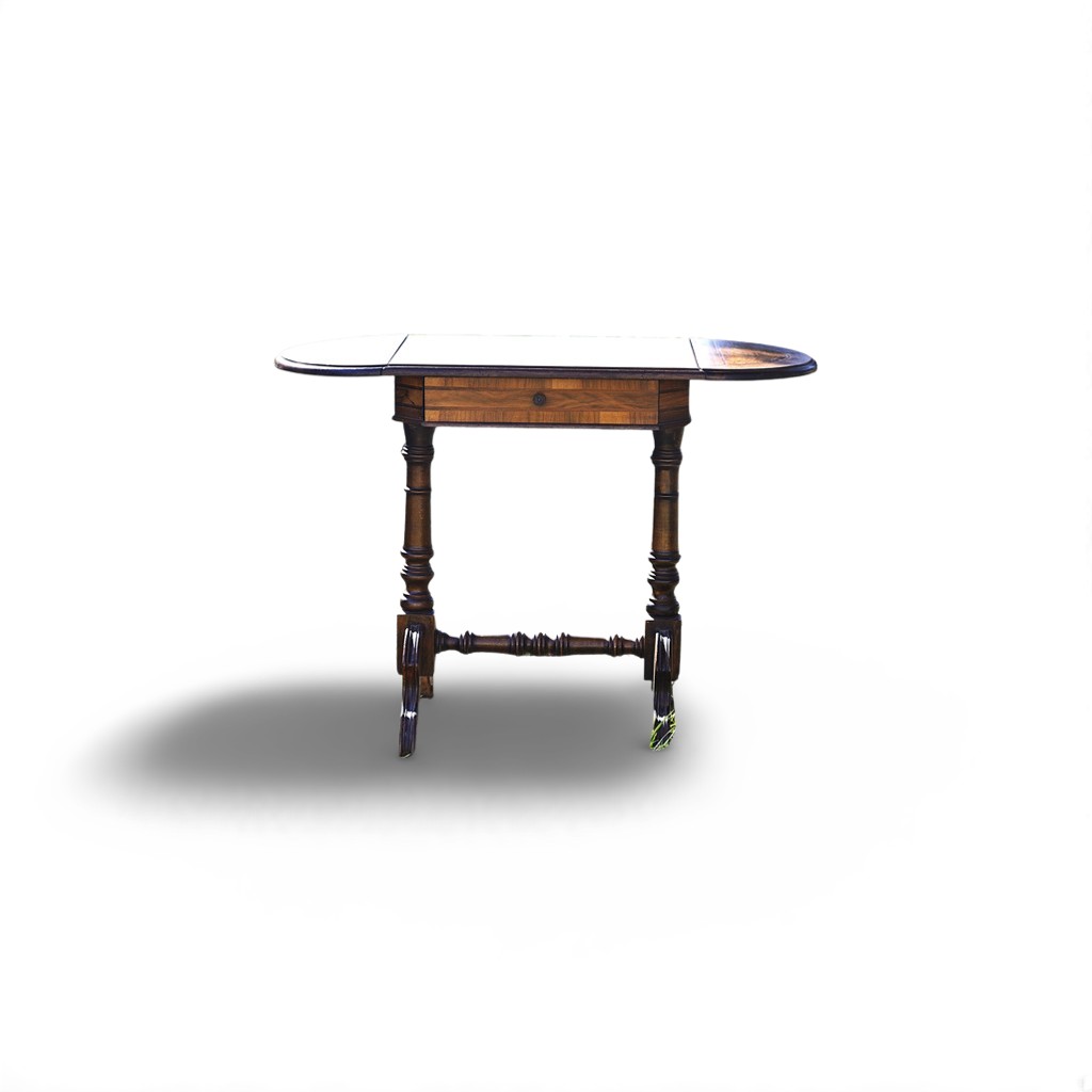 Location d’une petite table marquetée, tout droit sortie du Second Empire, où la fabrication de petites tables féminines a connu son apogée. Celle-ci est à la fois originale et pratique. Originale par son plateau en marqueterie organique qui fait penser à de la loupe d’orme. Originale par ses pieds à balustre, pratique avec ses deux abattants de part et d’autre du plateau, son tiroir, cette petite table à tout d’une curiosité. Son impact décoratif est indéniable, surtout si vous l’utilisez pour y poser des objets qui vous tiennent à coeur (fleurs, cadeaux d’invités, photos, voire présentoirs à gourmandises). Tout est possible, grâce à votre imagination et votre goût.