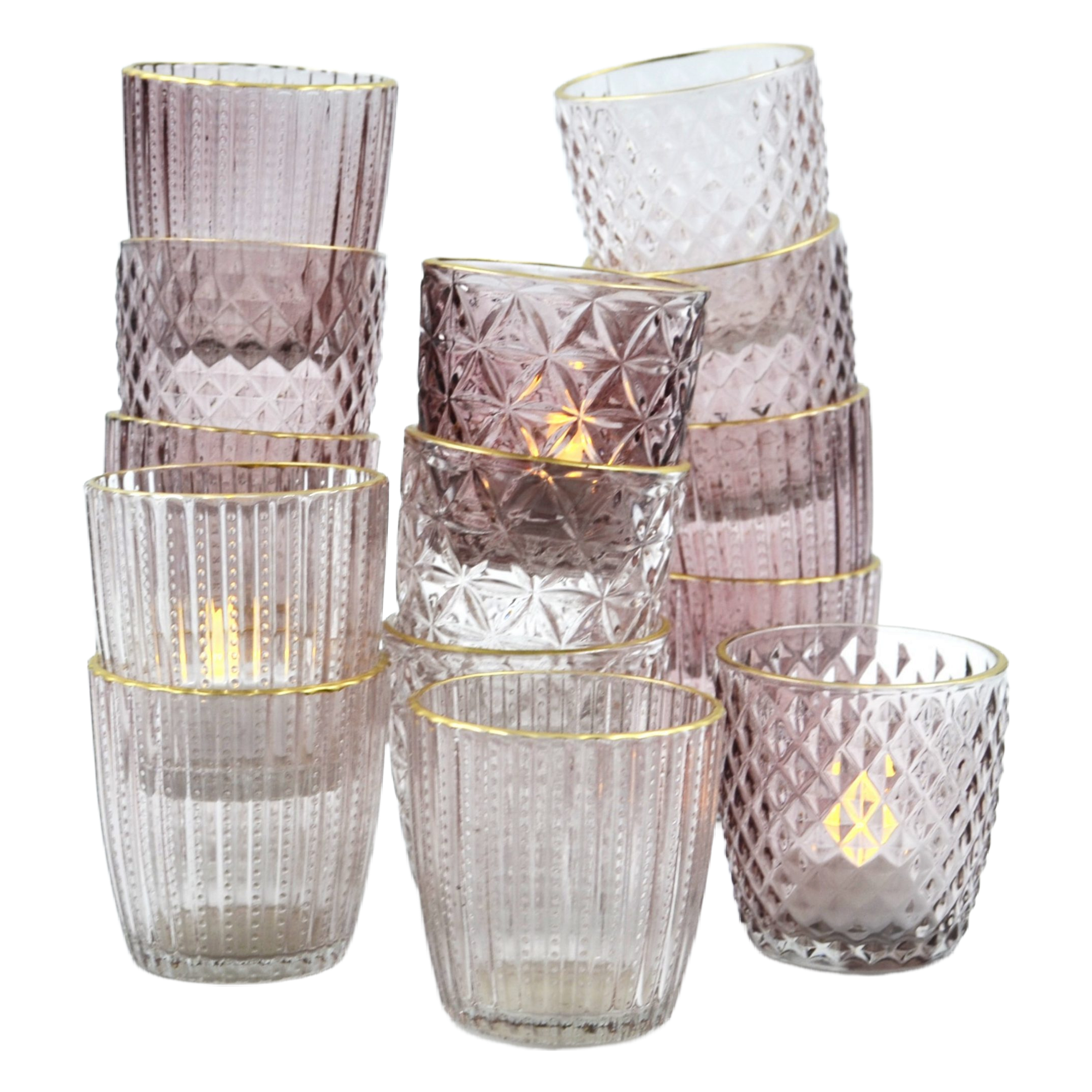 Ces photophores en verre sont récents. Joliment striés, décorés dans la masse, ils feront leur effet sur une table doucement romantique, ou en compagnie de fleurs pour un centre de table original. Leur col est éclairé d’un liseré doré.