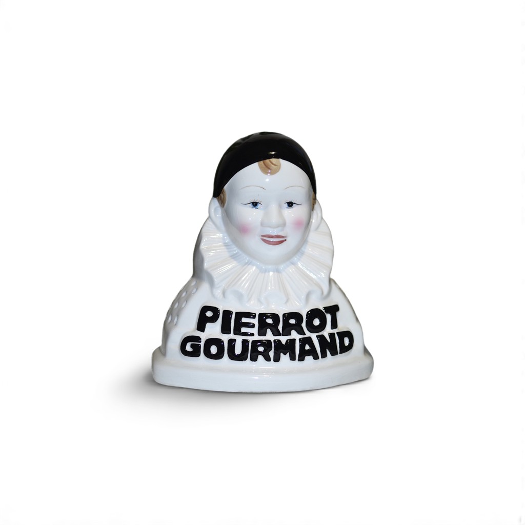 Location d’un présentoir à sucettes Pierrot Gourmand en céramique. Créé d’après la version lunaire du personnage de la Comedia Dell’Arte, celle du mime Deburau, si attendrissante, le buste de Pierrot Gourmand traverse l’histoire de la fabrique de confiseries depuis près d’un siècle. Ce petit personnage souriant et sympathique est un souvenir d’enfance et de douceur pour bon nombre d’entre nous. Ce modèle peut présenter 24 sucettes de forme longue (12 de chaque côté du buste).. Il invite petits et grands à faire un petit détour par le passé, et aura un charme fou sur votre bar à bonbons.