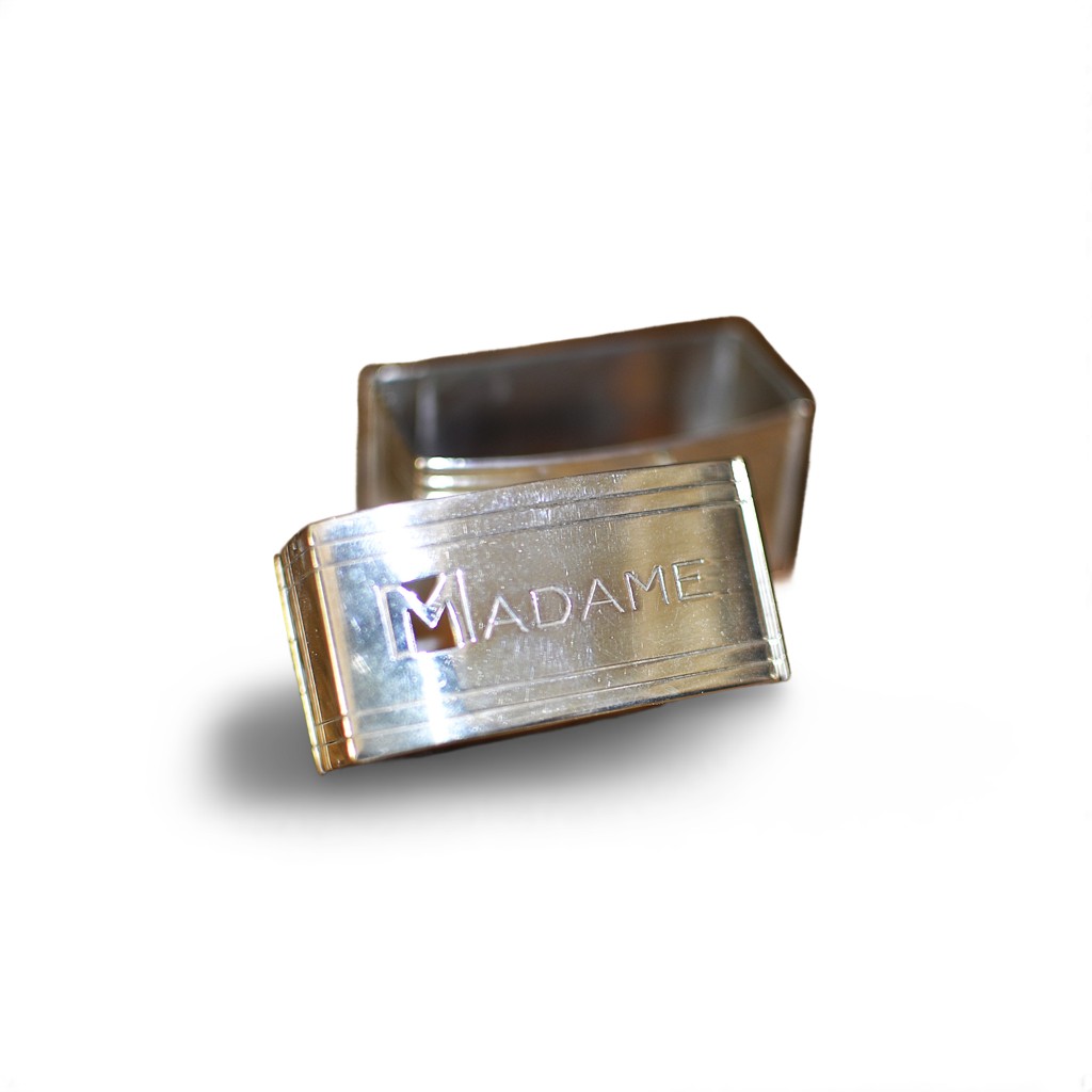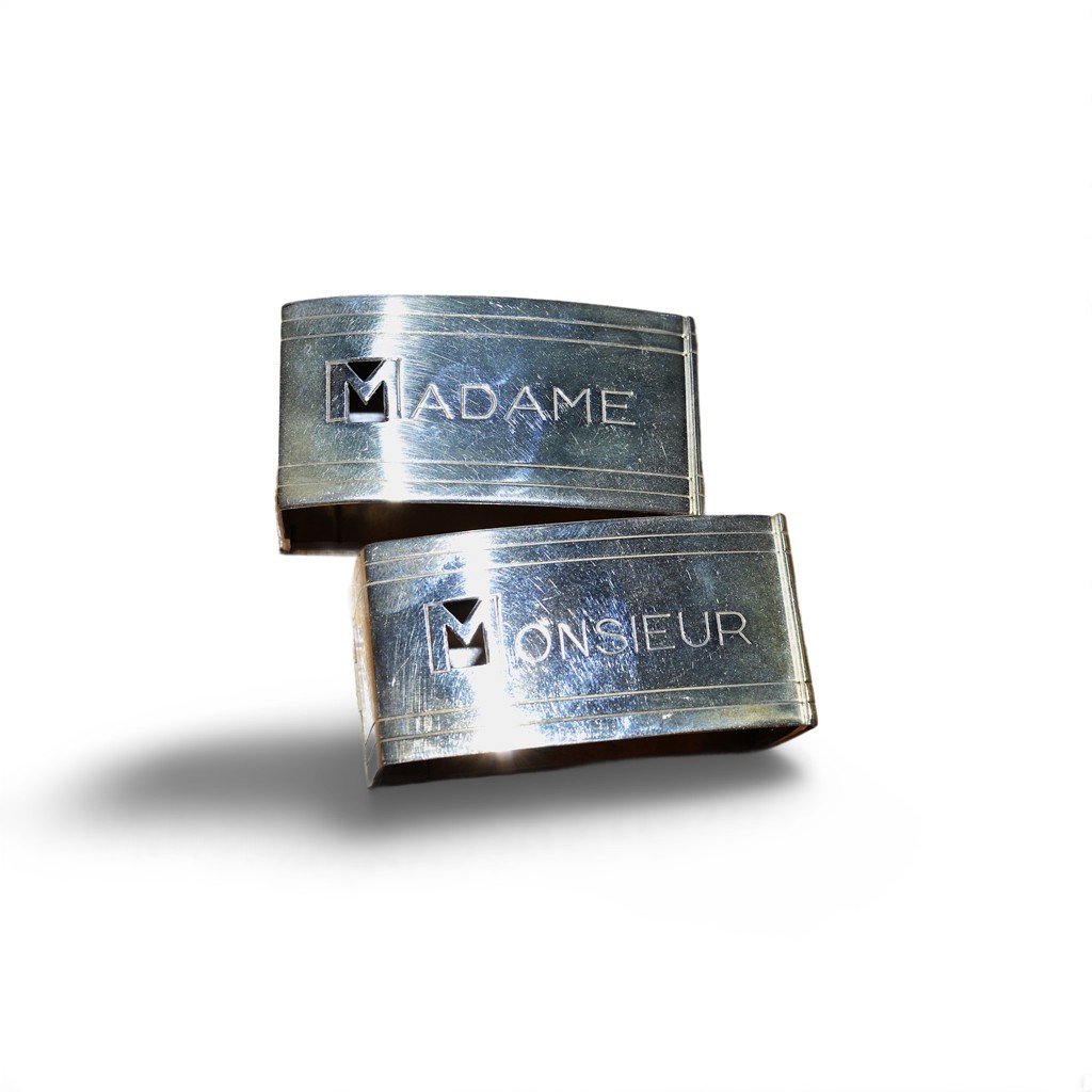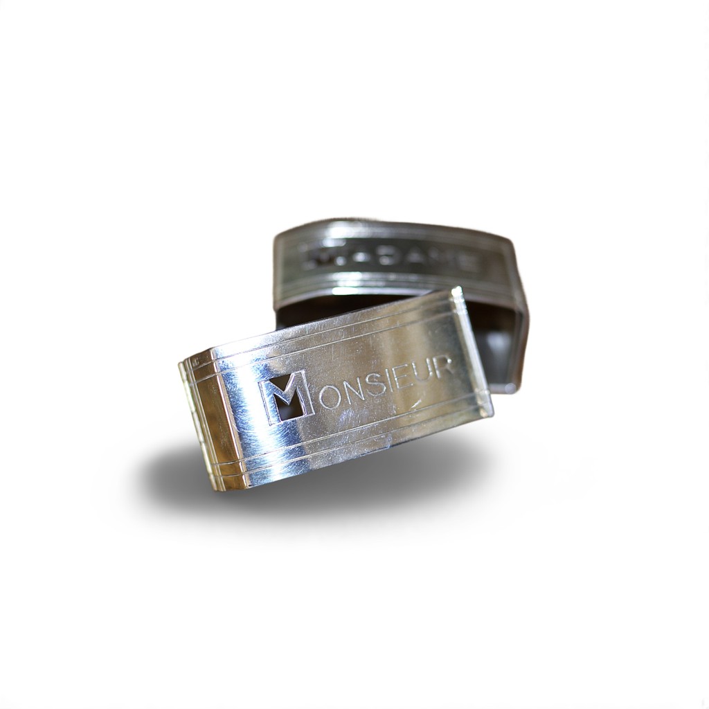 Voici une paire, que dis-je, un couple, de ronds de serviette en métal argenté gravé d’un Monsieur et d’un Madame charmants. Véritable petite attention pour un couple de nouveaux mariés de genres différents, ils feront merveille sur les serviettes du couple, et je gage même qu’ils occasionneront une petite émotion.