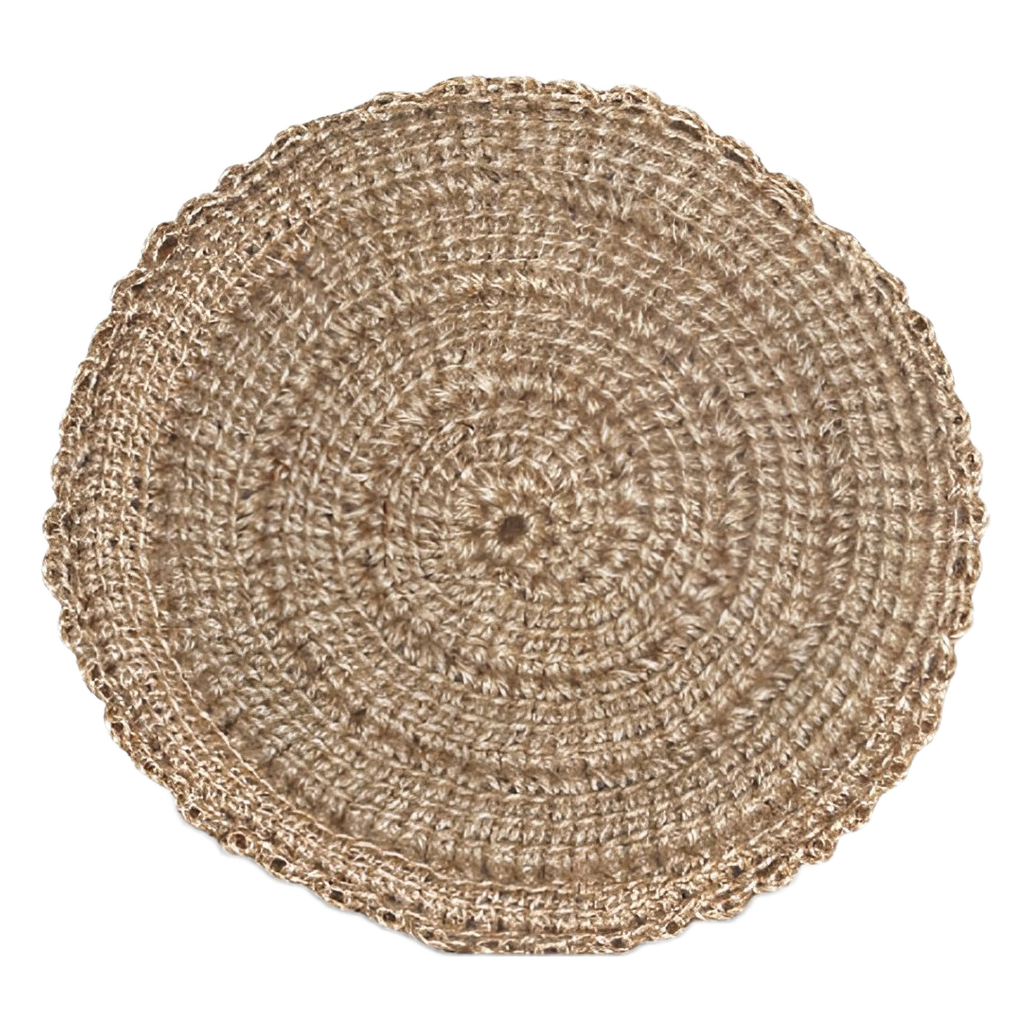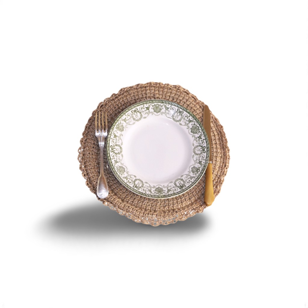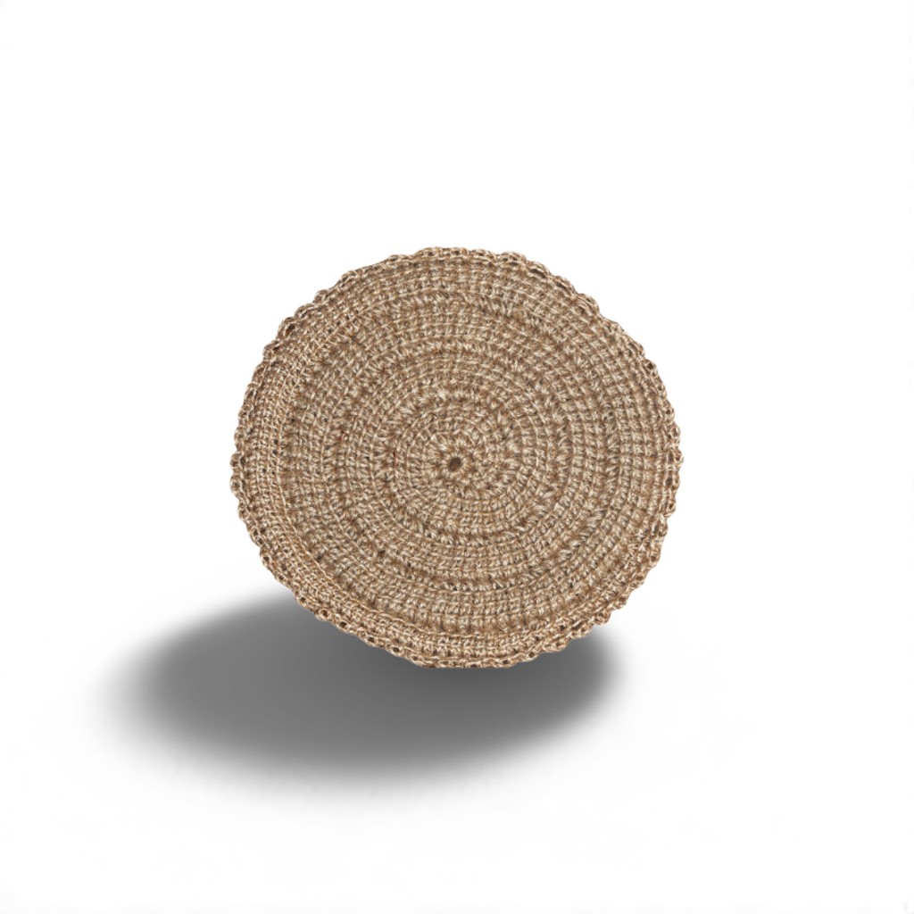 Location de sets de table en fil de jute, 100% naturels et 100% faits main. J’ai réalisé ces sets de table avec une cordelette de jute et un crochet tunisien. C’est un modèle simple, en spirale, terminé par une bordure de boucles. Le crochet tunisien apporte un relief subtil et élégant. J’ai choisi de faire moi-même ces sets de table pour échapper aux sempiternels sets en jonc de mer ou en jute venus d’Asie (je n’ai rien contre l’Asie), à des prix qui ne reflètent pas la réalité du travail mais qui parle très bien du mépris de la main d’oeuvre. Vous me direz que le fil de jute provient de l’Inde ou du Bangladesh et que ce n’est pas mieux. Ce à quoi je ne sais pas répondre de manière cohérente.
