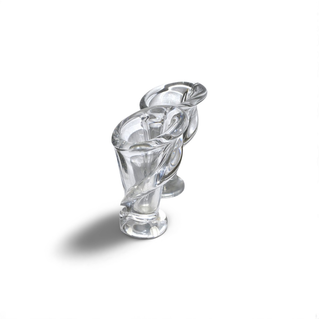 Location de petits vases torsadés en cristal de Vannes. Ce Vannes-ci n’est pas en Bretagne, mais en Meurthe-et-Moselle, près de Toul. Il s’agit d’une verrerie du XVIIIè siècle qui n’a cessé de croître. L’usine de Vannes-le-Châtel couvre en effet 40000 mètres carrés.